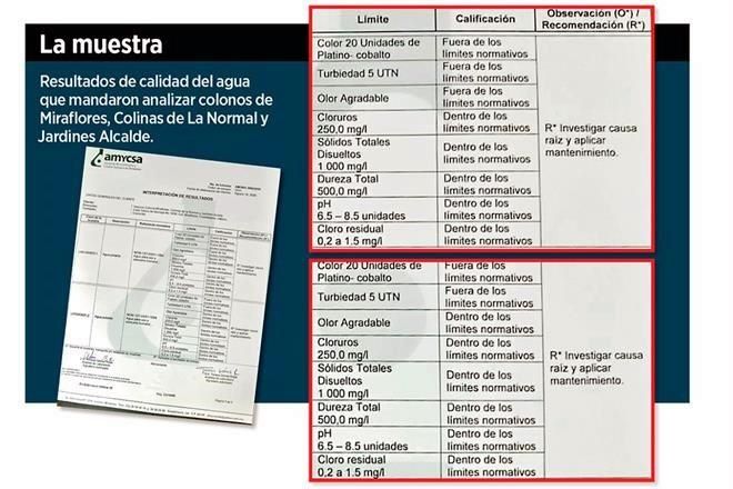 En los resultados del laboratorio certificado por la Entidad Mexicana de la Acreditación (EMA) se advierte que se debe de investigar la causa raíz y aplicar mantenimiento. El estudio fue solicitado por las colonias Miraflores, Colinas de La Normal y Jardines Alcalde que reciben agua turbia desde hace un año.