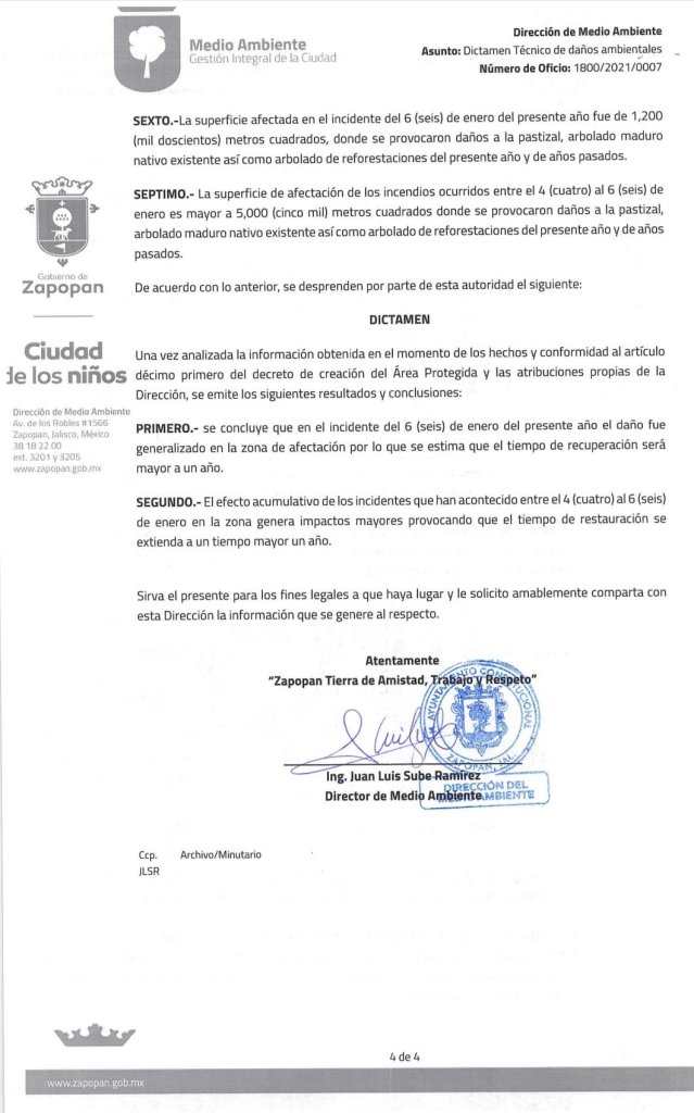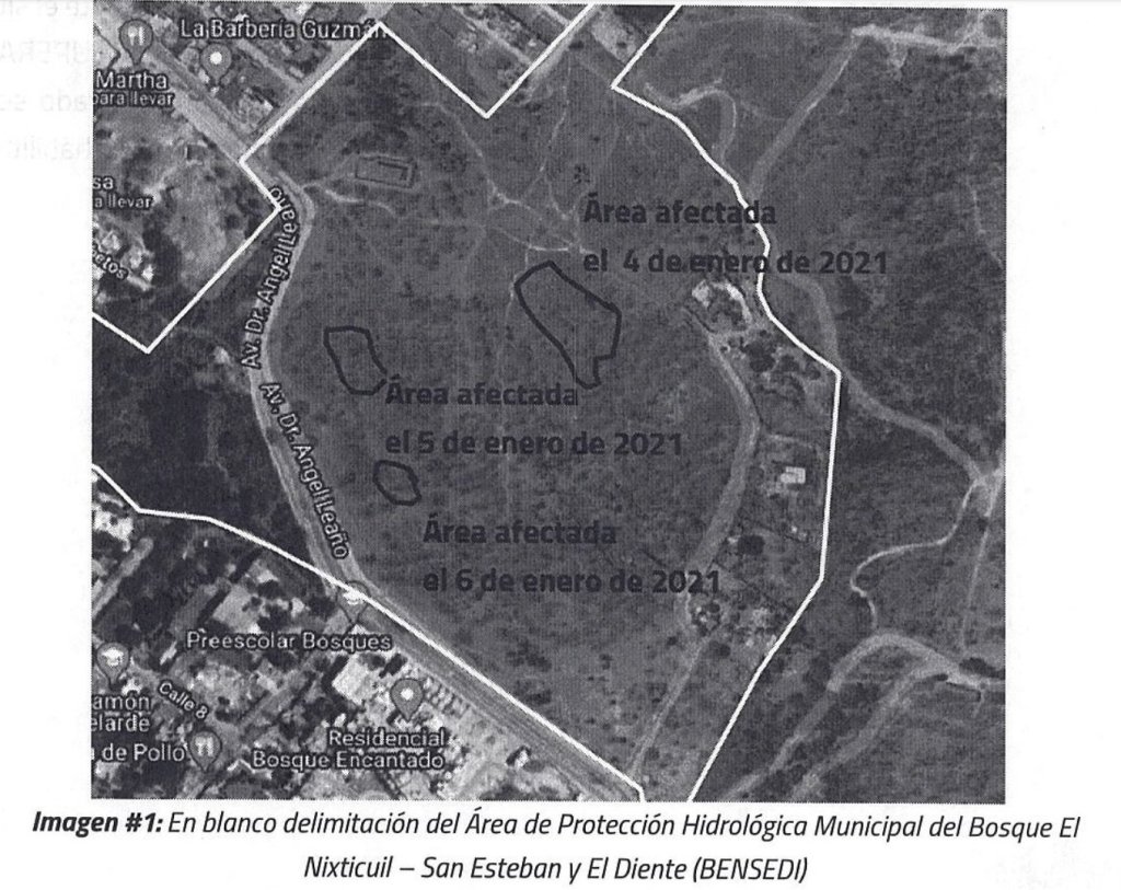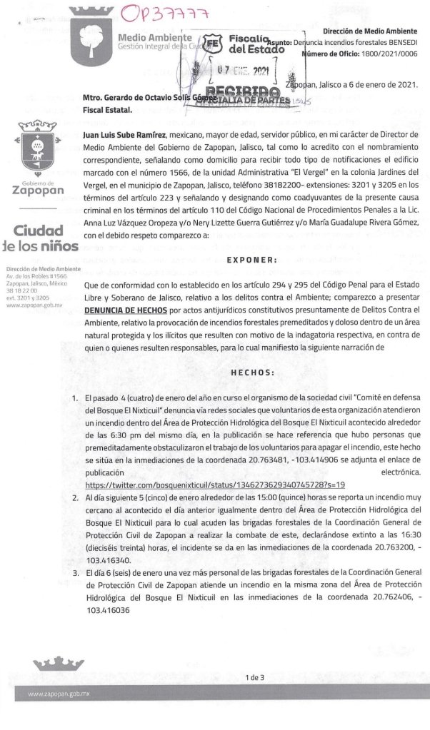 Una afectación de media hectárea (5 mil metros cuadrados) generaron los tres incendios forestales, ocurridos esta semana dentro del área natural protegida del Bosque El Nixticuil, de acuerdo con una denuncia penal presentada este jueves por el Ayuntamiento de Zapopan ante la Fiscalía del Estado, en contra de quienes resulten responsables.
