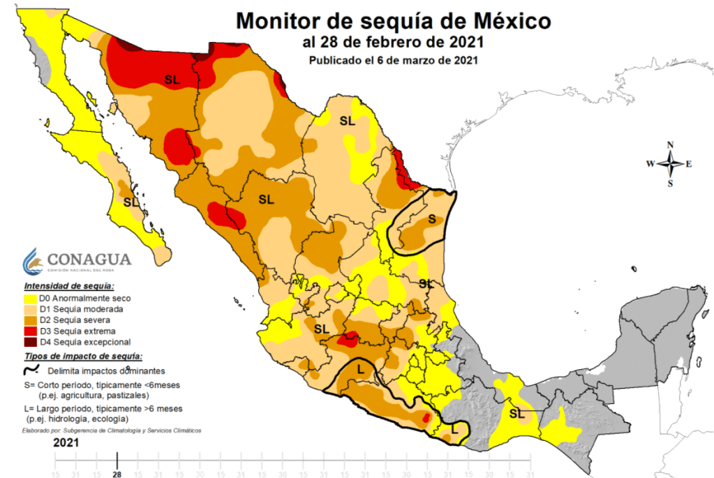 Por otra parte, en Sonora, Chihuahua, Sinaloa, San Luis Potosí, Durango, Tamaulipas y Nuevo León se presentan sequías severas, extremas y excepcionales.
