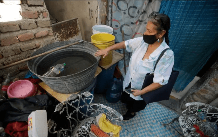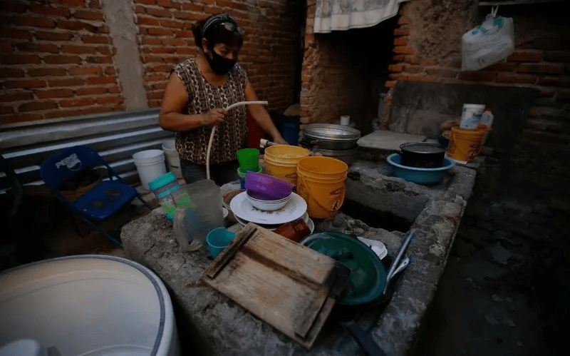 Sin tinaco, sin aljibe y sin agua desde hace un mes, Índira, quien vive en la Calle 16 de Septiembre, en el Centro de San Pedro Tlaquepaque, debe comprar cuatro garrafones diarios para lavar trastes y lavarse las manos. “Para bañarme tengo que ir a tocar a otras puertas”, lamentó.