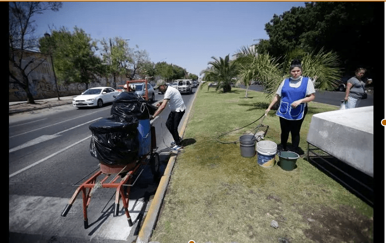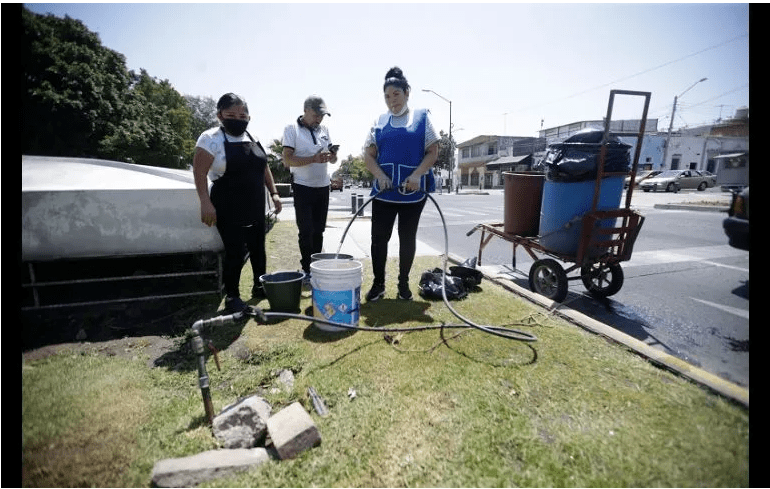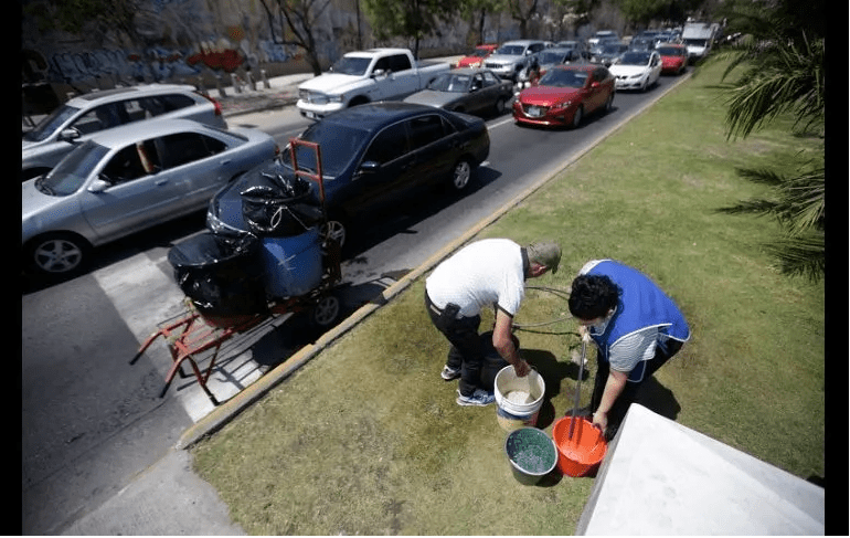 Debido a la falta de agua registrada desde hace varias semanas en la Zona Metropolitana de Guadalajara (ZMG), que ha traído consigo distintos cortes de agua en más de 200 colonias, vecinos y comerciantes de los alrededores del Panteón de Mezquitán han tomado como opción el rellenar sus recipientes de las tomas existentes en los camellones de la avenida Federalismo.