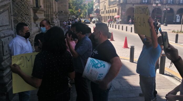La tarde de este jueves, alrededor de 20 habitantes y comerciantes de la Zona Centro de Guadalajara protestaron por el Andador Pedro Loza, frente a Presidencia Municipal y Palacio de Gobierno, para exigir una solución a la falta de agua que les afecta, al menos desde hace ocho días y que no ha sido atendida por el SIAPA, asegura el vecino Francisco Fuentes Orozco.