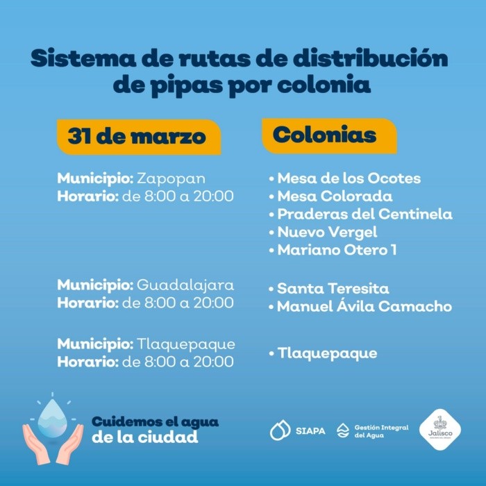 Ante la baja presión de agua que prevalece en algunas colonias de la Zona Metropolitana de Guadalajara (ZMG), el Sistema Intermunicipal de los Servicios de Agua Potable y Alcantarillado (SIAPA) continúa con el sistema de rutas de pipas gratuitas por colonia implementado desde el pasado 18 de marzo.