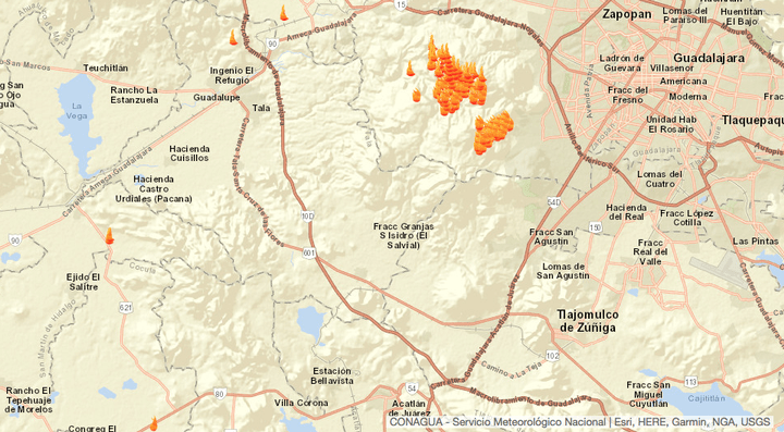 Jalisco reporta en este momento un total de cinco incendios activos, dos de ellos en la Región de La Ciénega, uno más en la región sur, otro en el sureste y uno más la costa Sierra Occidental. El de La Primavera y el de la Sierra de Amula son los de mayores dimensiones.