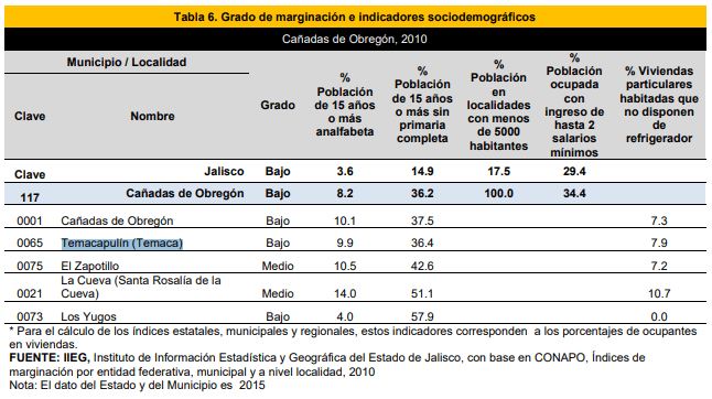 Según el Instituto de Información Estadística y Geográfica de Jalisco, Temaca tiene un bajo grado de marginación.
