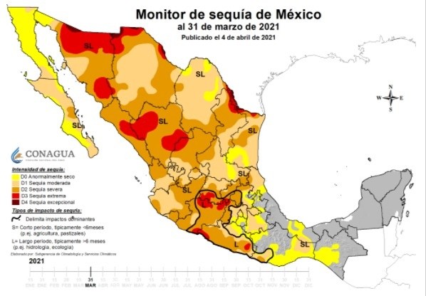 Además, siete de cada 10 atraviesan “sequía severa” y 37 más “sequía moderada”, al corte del 31 de marzo. De hecho, 72% del territorio nacional atraviesa por la misma anomalía climatológica.