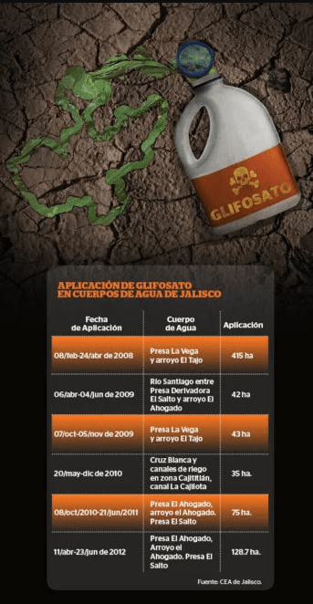 Entre los años 2008 y 2012 la Comisión Estatal del Agua de Jalisco (CEA) vertió glifosato en diversos cuerpos de agua del estado, incluyendo ríos, arroyos, presas, humedales y canales de riego; un herbicida que ha sido prohibido por el Gobierno mexicano por estar clasificado “como probable carcinogénico en humanos”.