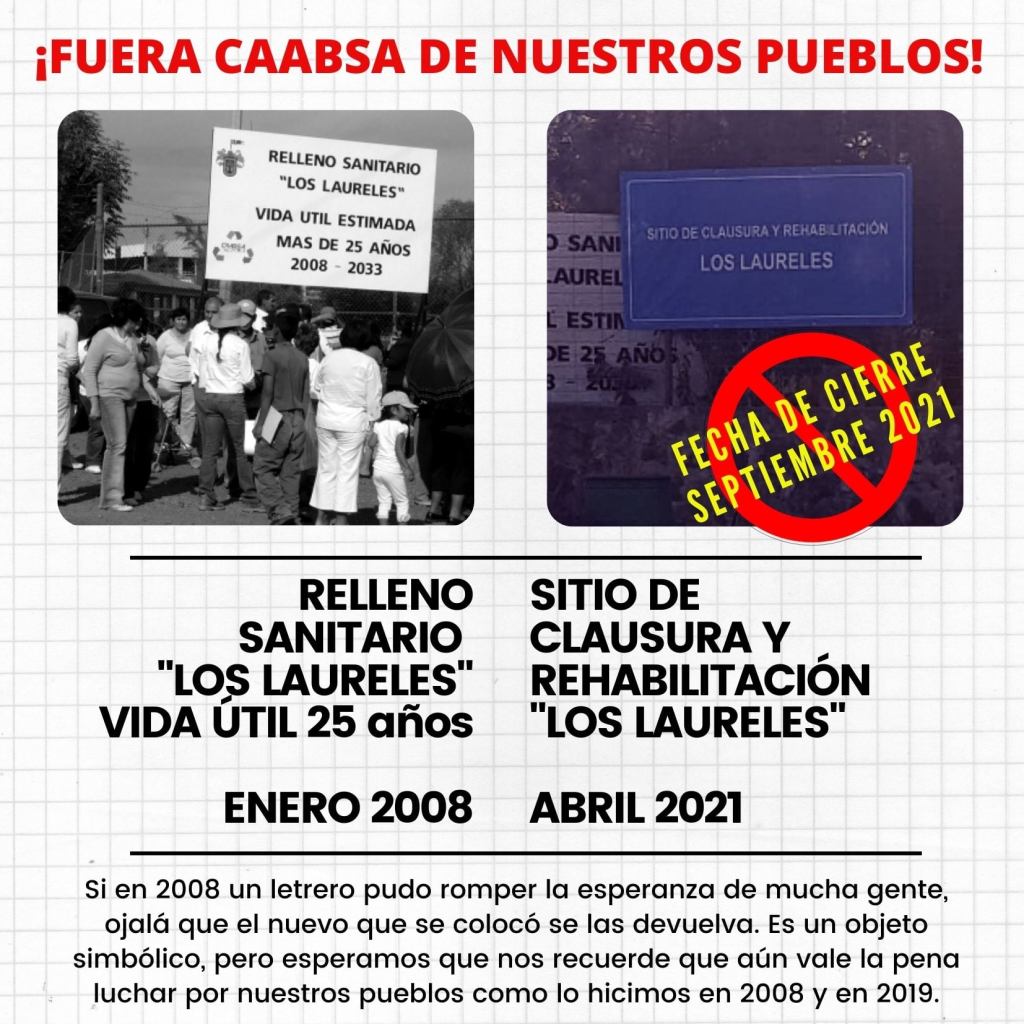 Tardamos 11 años en reaccionar como pueblos, con un hecho que exibió la inviabilidad de este proyecto al que pretendian darle 10 años más de vida, pues en este tiempo agotó lo que calcularon tardaría en saturarse de basura hasta 2033. Hoy se coloca un letrero que confirma el cierre y el proceso de rehabilitación que no se dará mágicamente. También habrá que luchar por ello y por justicia a favor de nuestros pueblos y en contra de esta empresa que nos ha orillado a normalizar la podredumbre junto con el resto de industrias que vierten sus venenos a nuestro río, a nuestro suelo y a nuestro aire.