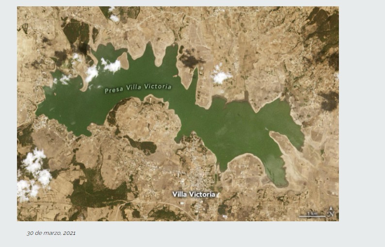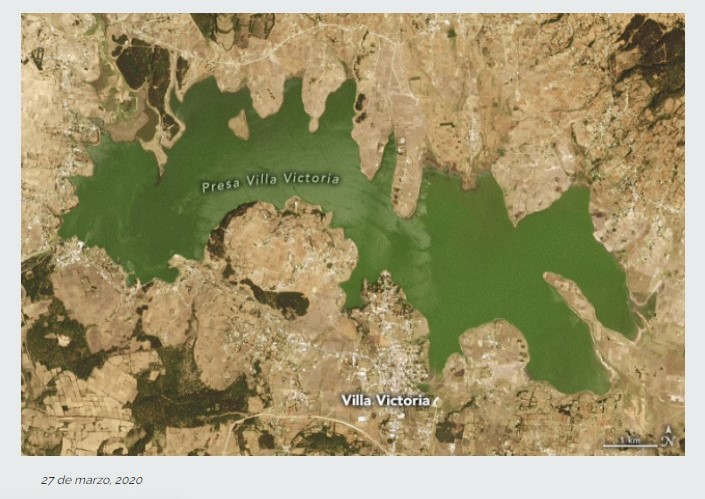 Las imágenes adquiridas, por el generador operacional de imágenes de tierra de nombre Landsat 8, muestran uno de los principales suministros de agua a la Ciudad de México, la presa Villa Victoria aproximadamente un tercio de su capacidad normal.