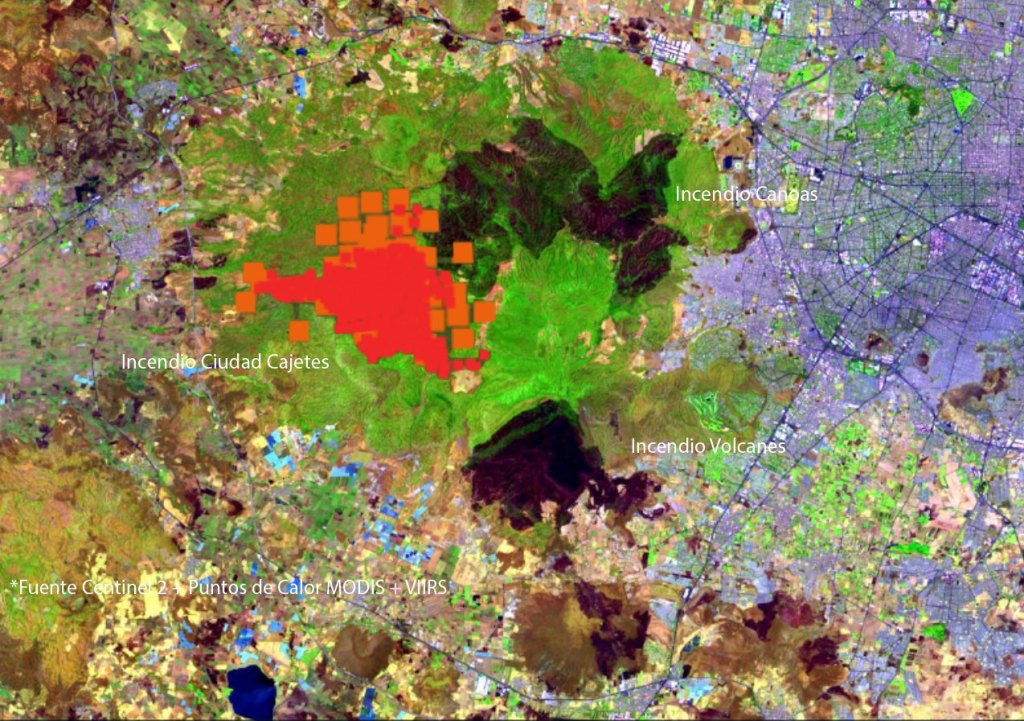 Imagen satelital que muestra los incendios de Canoas y Volcanes en negro + Puntos de Calor VIIRS y MODIS del Incendio actual en el bosque La Primavera, los puntos de calor en el incendio actual de Ciudad Cajetes suman ya una superficie en torno a las 3,300 hectáreas, habrá que esperar la imagen satelital para dimensionar la zona afectada directamente por fuego. Llama la atención cómo los polígonos de los tres incendios comienzan a unirse. Estamos siendo testigos de el peor año en afectaciones por incendios al bosque La Primavera, desde que existen registros. ![]()