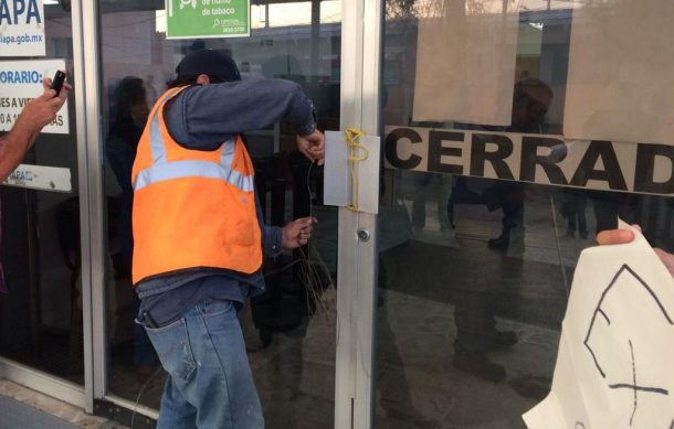 Vecinos de colonias como Agua Fría, Lomas de Tabachines, Mesa Colorada y Villas de Guadalupe bloquean desde las 7:00 de la mañana las oficinas del SIAPA en Zapopan a cuyas puertas les amarraron un alambre y cinta. (Por José Luis Jiménez Castro)