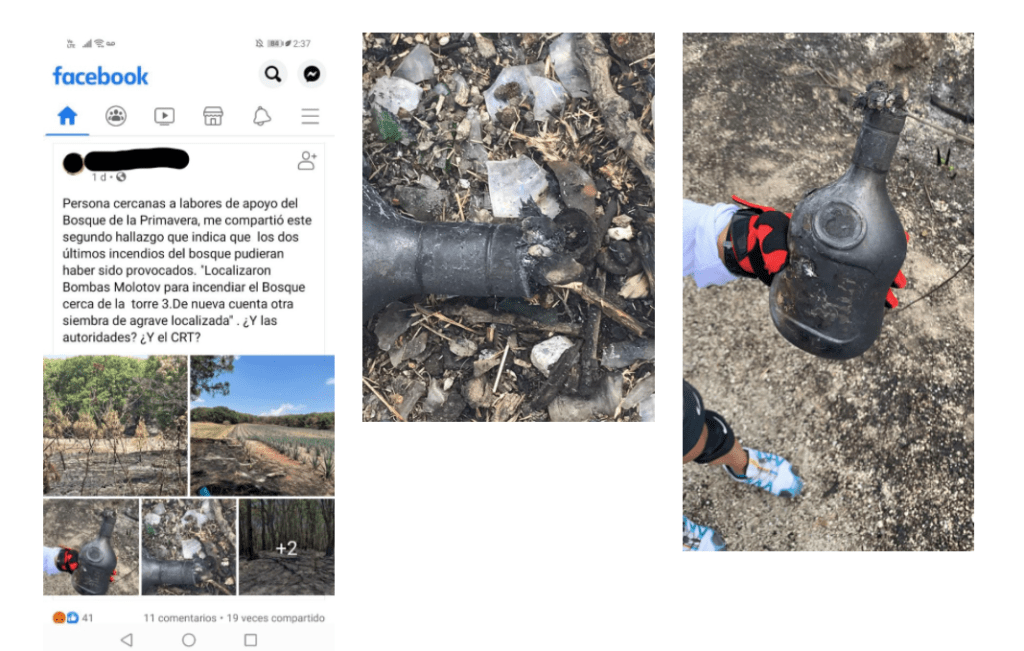 A la par, el colectivo Por Amor a los Bosques en su página de Facebook denunció las imágenes de lo que parecen ser “bombas molotov” localizadas en los alrededores de los sitios donde ocurrieron los dos últimos incendios en el área de La Primavera.