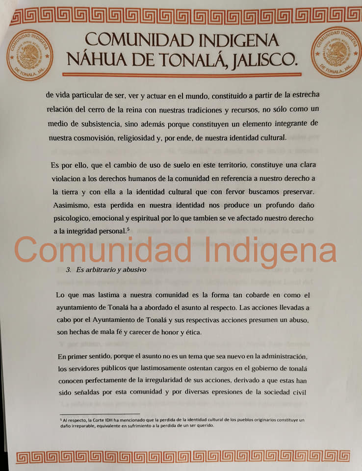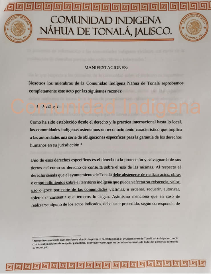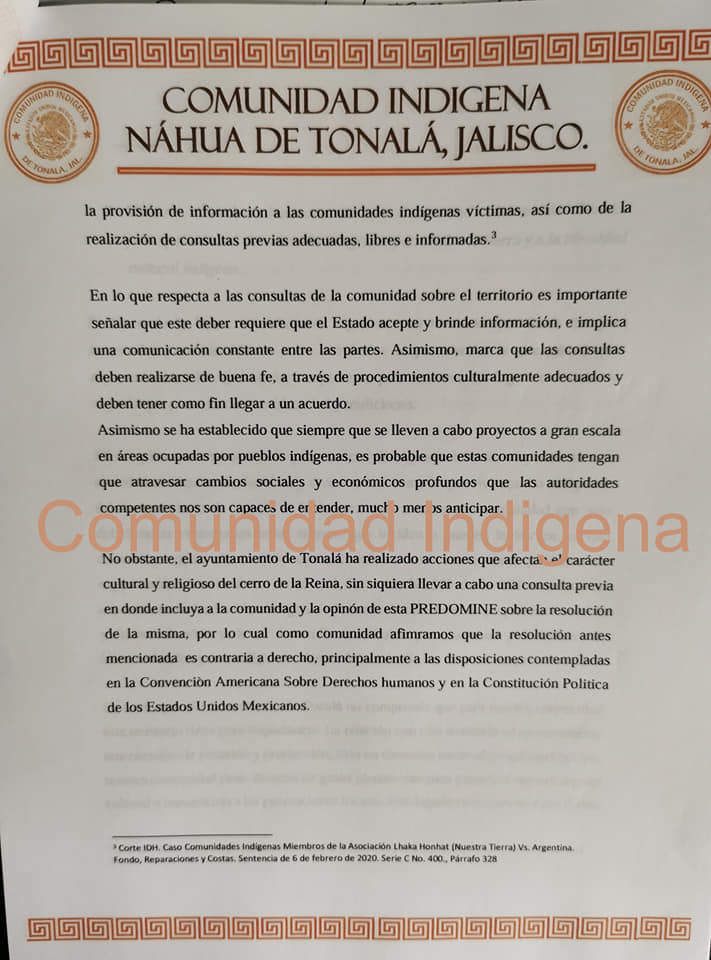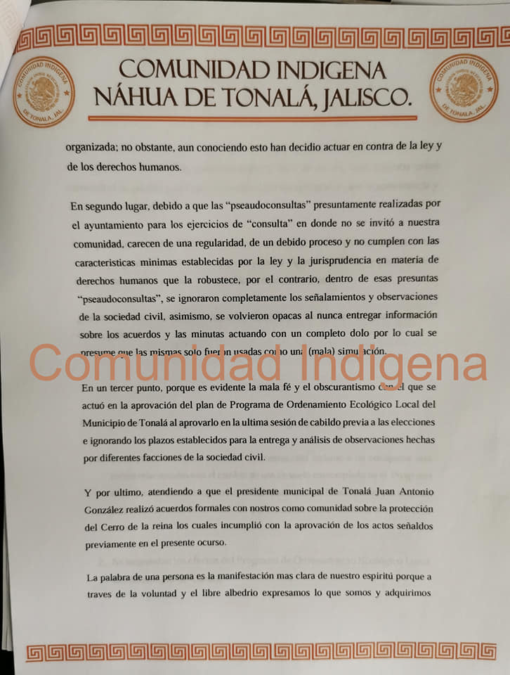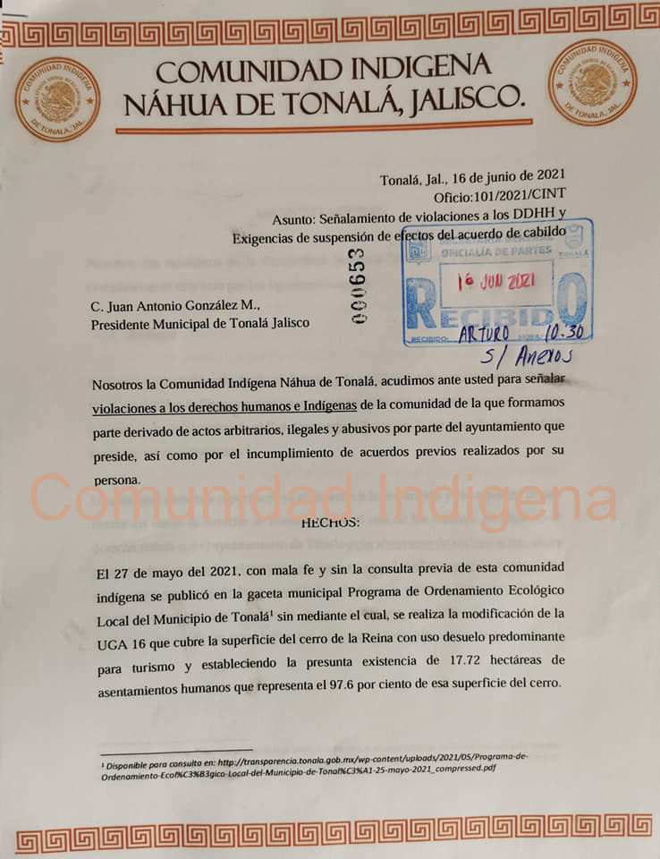El día de hoy la mesa directiva de la comunidad indígena Náhua de Tonalá acudió desde temprano a palacio municipal para hacerle entrega al presidente nuestro siguiente señalamiento respecto al acuerdo de cabildo llevado a cabo el 27 de mayo de este año. La comunidad indígena exige que se suspendan los acuerdos de cabildo relacionados al uso de cambio de suelo en el Cerro de la Reyna, ya que nunca se tomó en cuenta a nuestra comunidad, vulnerando nuestros derechos y nuestro territorio sagrado. Así mismo, dejamos constancia a través de este documento que no por el hecho de alzar la voz habremos de sufrir persecución o intimidación, ejercemos como cualquier otro ciudadano nuestro derecho a la libre expresión.Exhortamos a las autoridades que lejos de intimidarnos, se nos cuide, consulte y proteja.Agradecemos a todo el pueblo por el apoyo que nos están brindando, estamos dejando nuestra vida literalmente como nuestros ancestros «Tastoanes» por la defensa del territorio sagrado, al final de cuentas ustedes son la única protección que tenemos y si es que algo nos llega a pasar a nosotros, a cualquier compañero o ciudadano que se atreve a alzar la voz por el cerro, ya han de saber quiénes fueron los culpables. #CINTEnResistencia#Aixcaquema#ElCerroEsDeTodos