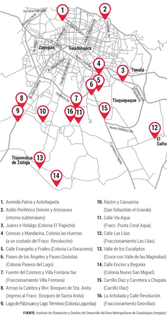 De los 16 nuevos puntos de inundación reportados este año en el Mapa Único de Inundaciones (MUI) del Instituto Metropolitano de Planeación (Imeplan), 14 se encuentran en zonas habitacionales de la Zona Metropolitana de Guadalajara.