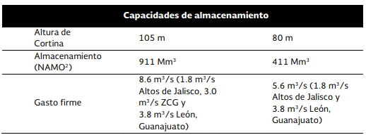 Esta capacidad de la presa, en ambas alturas, es la que señala la Comisión Nacional del Agua en el Libro Blanco «Construcción del Proyecto de Abastecimiento de Agua Potable El Zapotillo«.