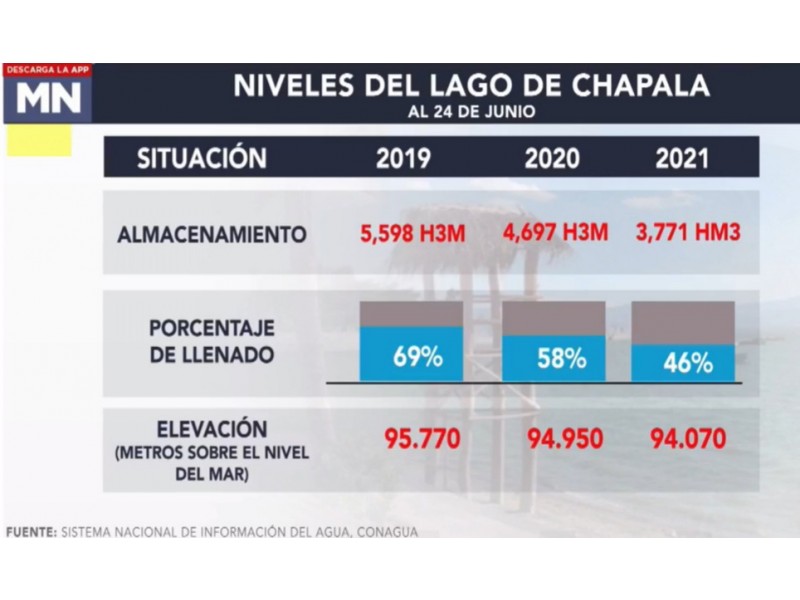 Chapala puede almacenar hasta 8 mil 126 hectómetros cúbicos de agua (8 billones 126 mil millones de litros) y al día de hoy apenas registra 3 mil 771.