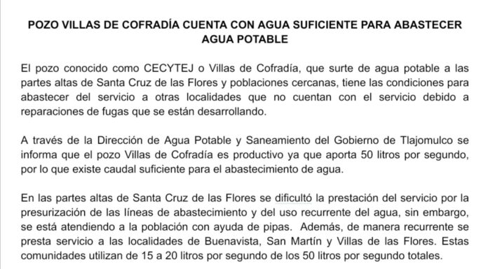 Sobre las quejas de un mal servicio en dicha población, el municipio asegura que se debe a que son reparadas fugas en la zona, lo que dificulta la presurización especialmente en las partes altas de Santa Cruz de las Flores; se estimó que las reparaciones estarán concluidas durante este mismo martes.