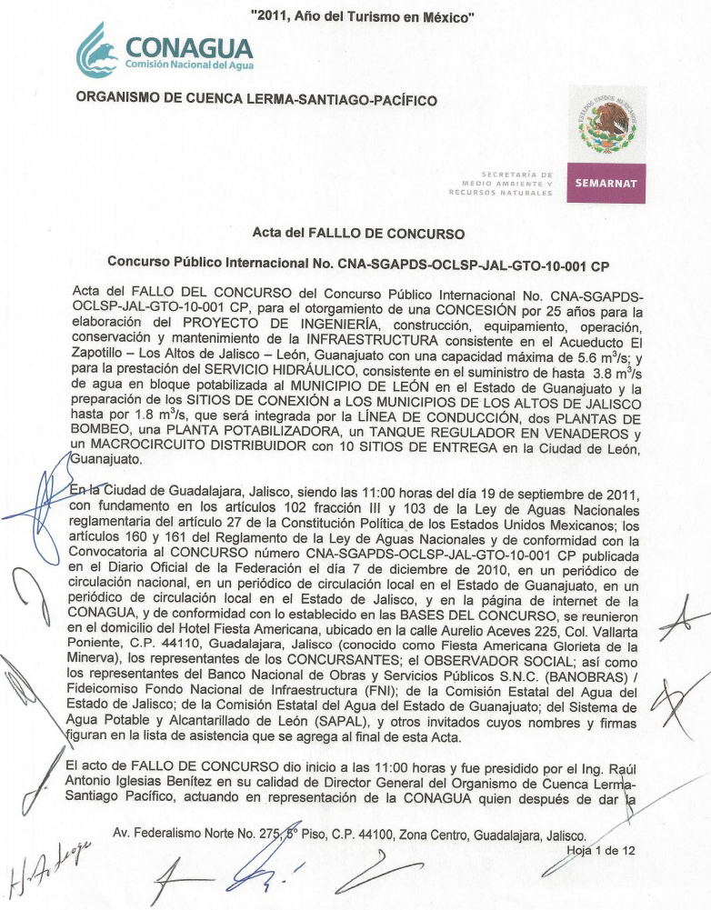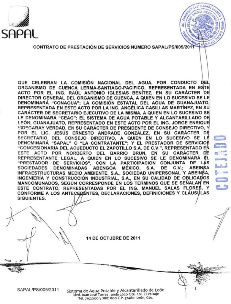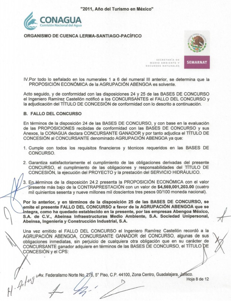 El 14 de octubre de 2011 y después de haber ganado la licitación de un concurso internacional para la construcción del acueducto El Zapotillo-León, Guanajuato, la empresa española Abengoa obtiene la concesión por 25 años para llevar agua a dicha ciudad y que incluye la línea de conducción y otras obras como plantas de bombeo y una planta potabilizadora, todo con un costo de seis mil 866 millones de pesos. 1 of 2