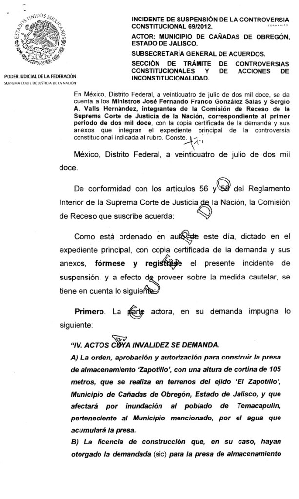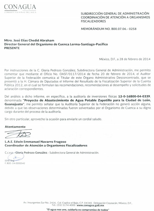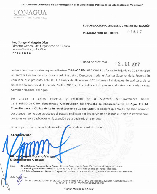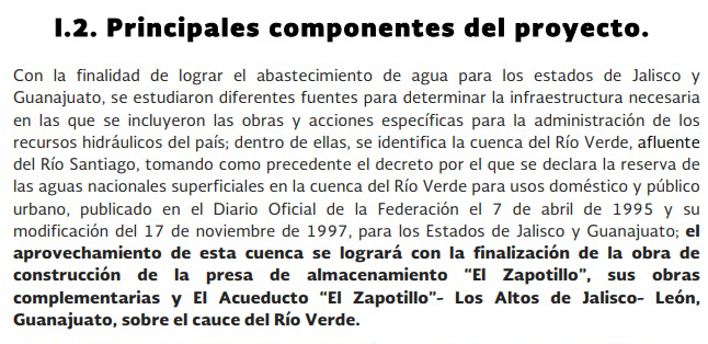 Pero esta presa era para el vecino estado y prueba de ello son distintos oficios dirigidos desde la Conagua al organismo de Cuenca Lerma, Santiago, Pacífico, donde dan cuenta del nombre oficial: “Construcción del Proyecto de Abastecimiento de Agua Potable Zapotillo para la Ciudad de León, en el Estado de Guanajuato”.