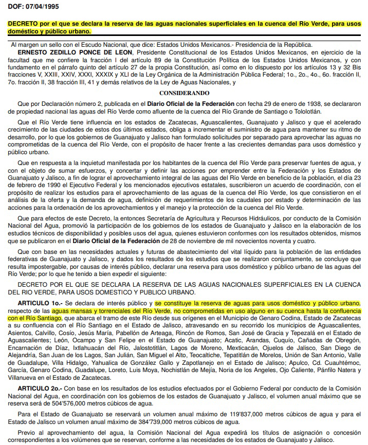 A partir de que el presidente Ernesto Zedillo reservara la cuenca del río Verde para uso doméstico y público urbano en 1995 y 1997, la Comisión Nacional del Agua (Conagua) comenzó a estudiar las distintas opciones para favorecer a Jalisco y a Guanajuato, y resolvió dos presas: El Zapotillo para los Altos y León y Arcediano para Guadalajara. 1 of 1