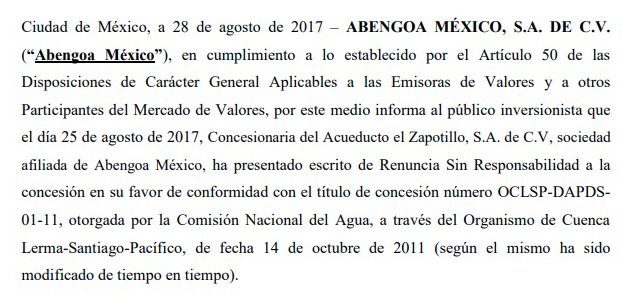 Pero Concesionaria del Acueducto El Zapotillo, S.A. de C.V., filial de Abengoa, no abandonó por completo la licitación ganada y el contrato firmado con el Sistema de Agua Potable y Alcantarillado de León Guanajuato por la construcción de la obra.