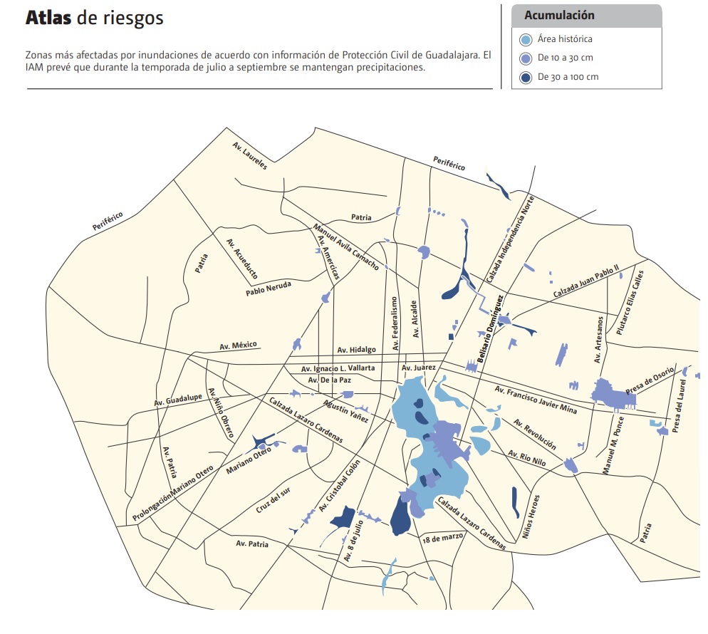 De acuerdo con el académico de la Universidad de Guadalajara (UdeG), Luis Valdivia Órnelas, algunos de los puntos que presentarán problemas durante este temporal de lluvias y que están ubicadas en zonas marginadas son: La Martinica, Indígena, Las Pintas, El Quince y Ferrocarril. En el caso de las vialidades, las avenidas Revolución, López Mateos, Mariano Otero y la Calzada Independencia; pero todos los municipios tienen áreas problemáticas. Por ejemplo: en Guadalajara tiene la zona de la colonia Ferrocarril o San Andrés. En Zapopan, Arroyo Seco, El Garabato o Colomos. Tlajomulco de Zúñiga presenta este problema en el canal de Las Pintas, en las partes bajas de El Ahogado o en Santa Anita, por mencionar algunos, y finalmente en Tonalá en Las Rucias.