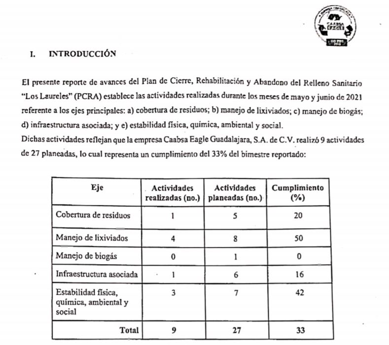 Aunque el Gobierno de Jalisco se comprometió a que en septiembre estaría cerrado el basurero Los Laureles, la empresa concesionaria de la basura CAABSA EAGLE, responsable de administrar el tiradero, reportó avances en apenas en una tercera parte de las actividades de cierre. Según el reporte bimestral de avances mayo-junio 2021 que CAABSA entregó a la Secretaría del Medio Ambiente y Desarrollo Territorial, en torno al Plan de Cierre, Rehabilitación y Abandono del Relleno Sanitario «Los Laureles», al cual Líder Informativo tuvo acceso, de 27 actividades que estaban planeadas para el bimestre, apenas hubo avances en 9, por lo que reporta un cumplimiento del 33 por ciento. Hay retrasos importantes en temas como el tratamiento de lixiviados, con apenas un 16 por ciento de avance, a pesar de que desde 2019 el propio gobernador Enrique Alfaro prometió que comenzaría el cierre y abandono del basurero ubicado en los límites de Tonalá y El Salto.