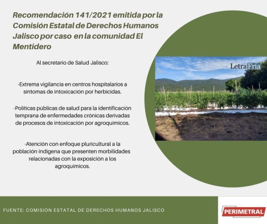 Aunque la Comisión Estatal de Derechos Humanos Jalisco publicó la Recomendación 141/2021 confirmando lo denunciado a partir de estudios clínicos y notas periodísticas se sigue sin prohibir el glifosato.