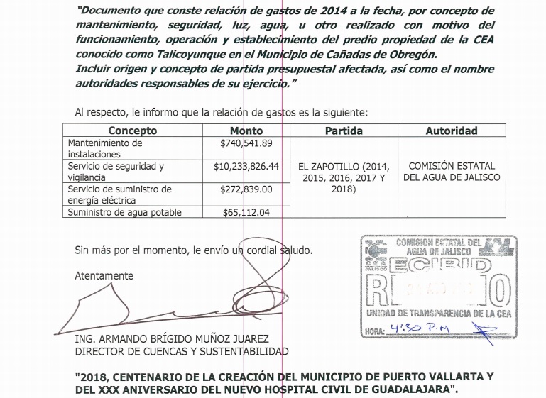 En una investigación realizada por el Instituto Mexicano para el Desarrollo Comunitario A.C. (IMDEC), explica que la Comisión Estatal del Agua de Jalisco (CEA), del 2014 al 2018, pagó a la empresa Seguridad Especializada en Logística en Custodia y Seguridad Privada, S.A de C.V. (SEMAG), la cantidad de 10 millones 233 mil 826 pesos por el servicio de seguridad y vigilancia en el predio denominado Talicoyunque, esto conforme a los datos obtenidos por la Unidad de Transparencia de la dependencia solicitados por el IMDEC.