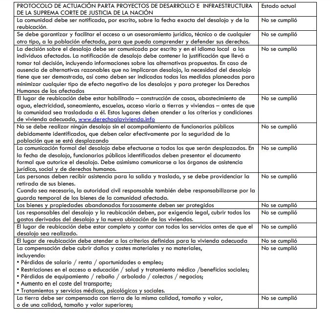 Según un análisis realizado por el IMDEC, en el caso del desplazamiento forzado de la comunidad de Palmarejo al predio de Talicoyunque, la CEA no cumplió ninguno de los puntos del Protocolo de Actuación para Proyectos de Desarrollo e Infraestructura de la Suprema Corte de Justicia de la Nación.