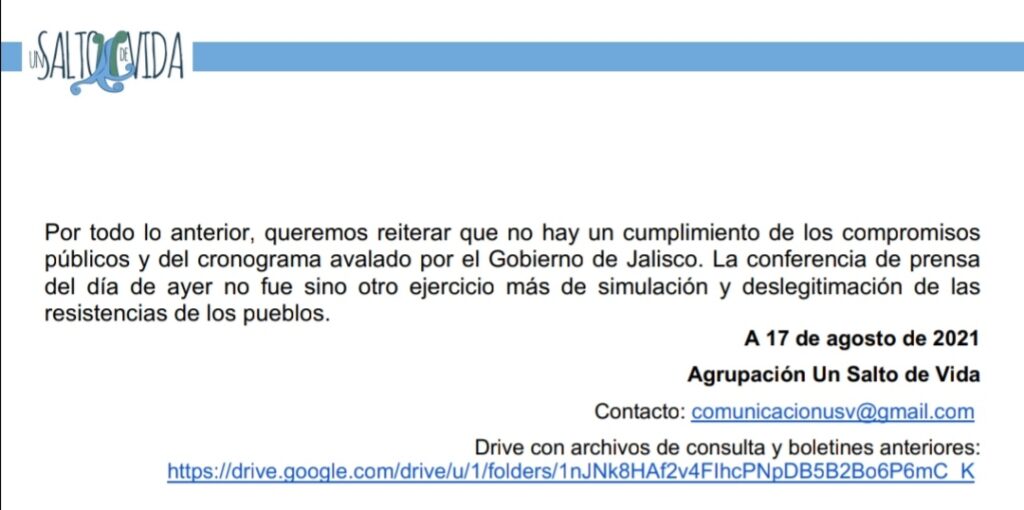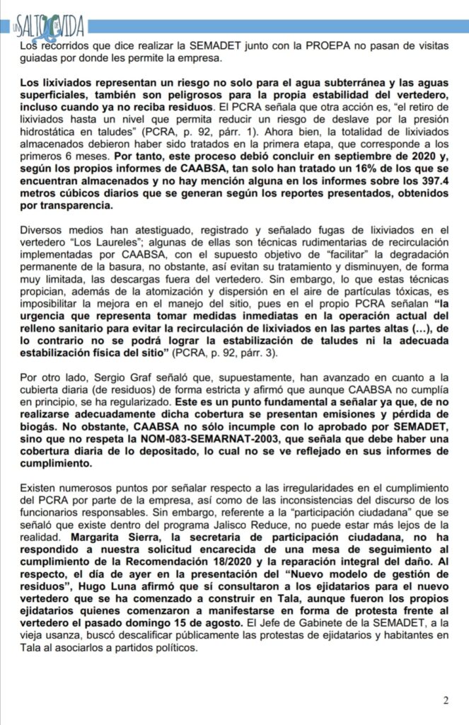 Pese a que el Gobierno de Jalisco niega que exista contaminación por lixiviados, los jugos que emanan de la basura, en el tiradero Los Laureles, pobladores de El Salto e integrantes de la agrupación Un Salto de Vida señalan que siguen las fugas por la mala gestión del vertedero de Caabsa.«Es inaudito que (el) propio secretario de a medio ambiente, Sergio Graf, a pesar de su trayectoria académica y de conocer de cerca el estado de las cosas, se preste a la farsa que dicta Hugo Luna en defensa de la concesionaria, al negar un hecho tan evidente como los ríos caudalosos de lixiviados, los veneros y manantiales cobrizos que brotan y escurren hacia el arroyo de ElPopul», señala la organización en un comunicado emitido la noche del martes, donde recuerdan que la contaminación ha sido documentada por periodistas, pobladores, académicos y la propia Comisión Estatal de Derechos Humanos Jalisco en la recomendación 18/2020.