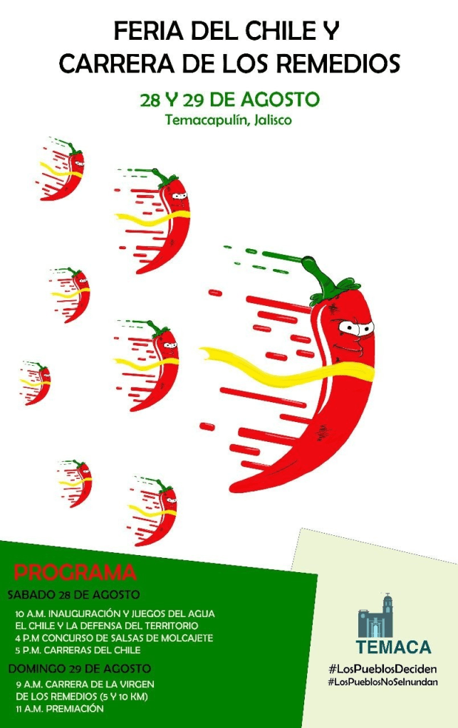 ¡Vamos a Temaca!A la Feria del Chile y Carrera de los Remedios, 28 y 29 de agosto, en Temacapulín, Jalisco, México.#LosPueblosDeciden#LosPueblosNoSeInundan#TemacaViveApoyemos su lucha. #SolidaridadConTemacaParticipa en los Juegos del Agua, el Chile y Defensa del Territorio, el Concurso de Salsas de Molcajete, las Carreras del Chile (subiendo dos cerros), Carrera de los Remedios (5 y 10 km), y más. ![]()