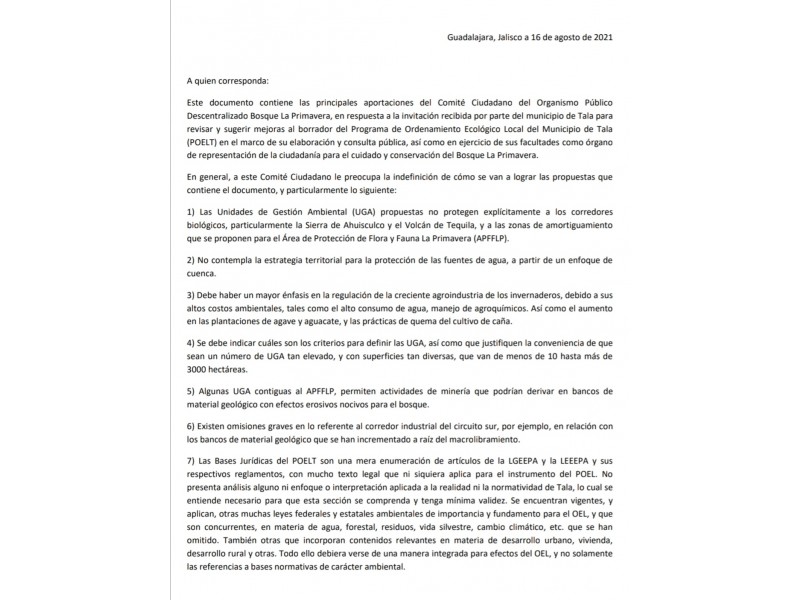 Señalamientos del Comité Ciudadano del Bosque La Primavera al Ayuntamiento de Tala:
