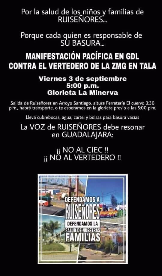 Vecinos de Tala anunciaron en redes sociales una manifestación para la tarde de este viernes, en la glorieta de la Minerva, para exigir al Gobierno de Jalisco y al Área Metropolitana de Guadalajara que la basura de la ciudad no sea llevada a la región Valles.