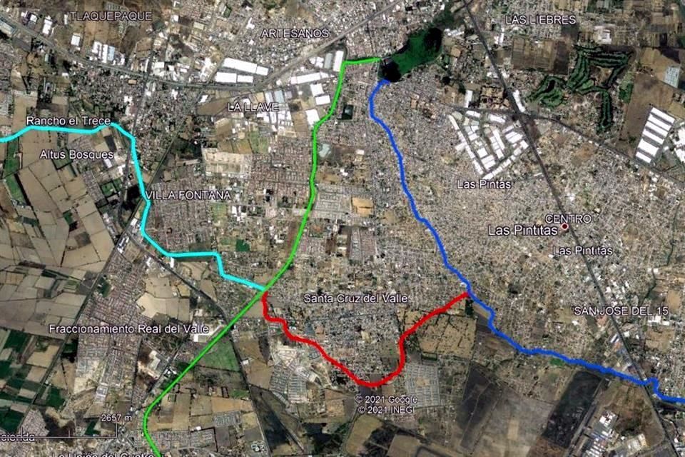 - El canal de Las Pintas (verde) corta o mutila el tramo del Arroyo Seco (rojo) hacia La Colorada (azul) y desde entonces el escurrimiento pluvial es interceptado y enviado a la presa de Las Pintas. Foto: Cortesía