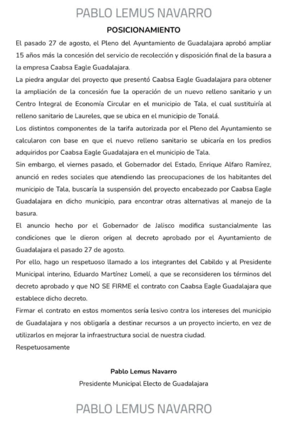 Ante la cancelación del proyecto y el próximo cambio de administración, Lemus advirtió que no se dispone del tiempo para la construcción de un nuevo basurero aunado a que los ya establecidos representan la captación de basura que producen los municipios de Zapopan, Guadalajara, Tlaquepaque , Tlajomulco, El Salto y Tonalá, ademas de que implicaría una reducción en cuanto a los costos y traslado de desechos.