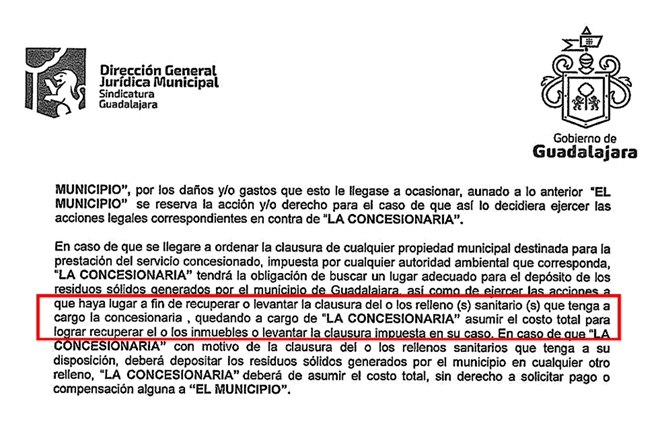 «En caso de que se llegare a ordenar la clausura de cualquier propiedad municipal destinada a la prestación del servicio concesionado, la concesionaria tendrá obligación de buscar un lugar adecuado para el depósito de los residuos», señala.