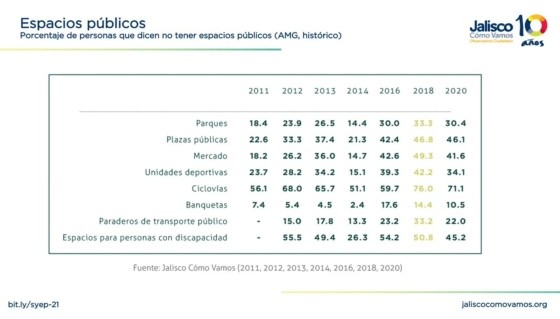 Según un ejercicio realizado por el observatorio Jalisco Cómo Vamos, el 30.4% de los encuestados no tiene acceso a parques, lo mismo en el resto de espacios y servicios públicos