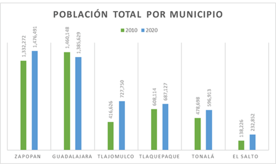 De 2015 a 2020 el municipio de Guadalajara pasó de tener un millón 460 mil 148 pobladores a un millón 385 mil 629 el año pasado, es decir, 74 mil 519 personas dejaron Guadalajara en ese periodo de tiempo. Pero ¿a dónde se fueron todas esas personas? A diferencia de Guadalajara, el resto de los municipios del Área Metropolitana de Guadalajara (AMG) aumentaron su población en los últimos 10 años, especialmente Zapopan, que pasó de tener una población de un millón 332 mil 272 a un millón 476 mil 491, cifra que le valió para convertirse en el municipio con más habitantes del AMG.