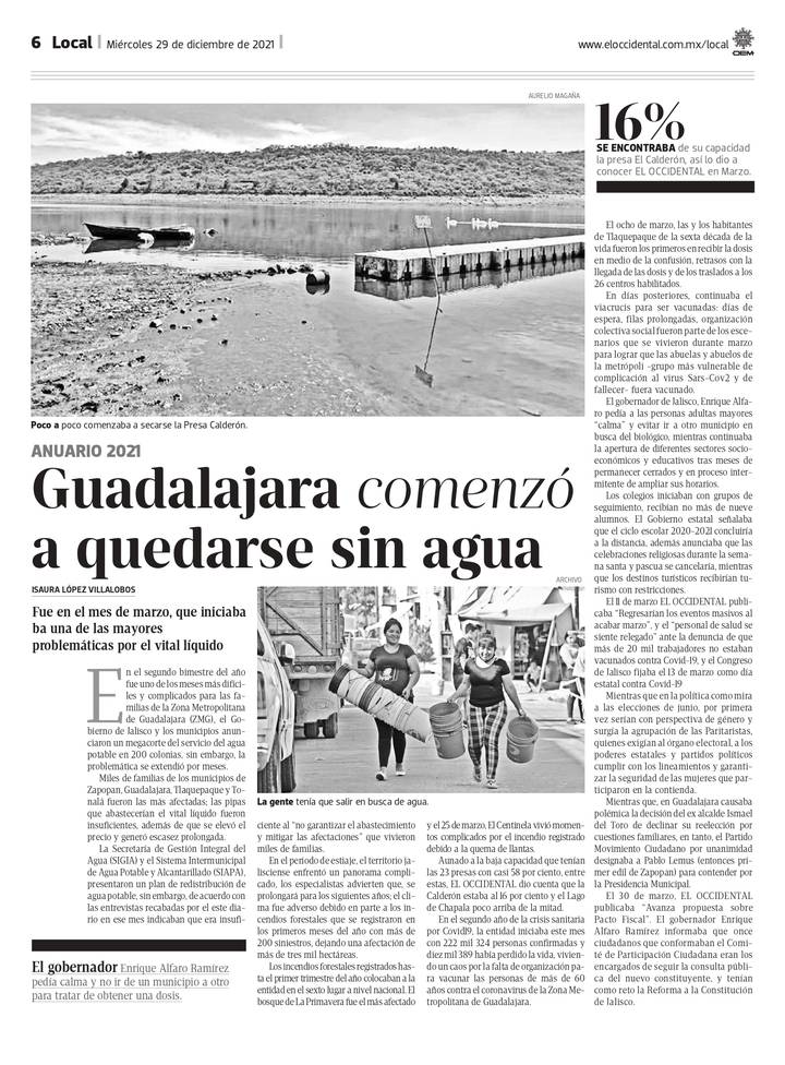 Aunado a la baja capacidad que tenían las 23 presas con casi 58%, entre estas, El Occidental dio cuenta que la Calderón estaba al 16% y el Lago de Chapala poco arriba de la mitad.