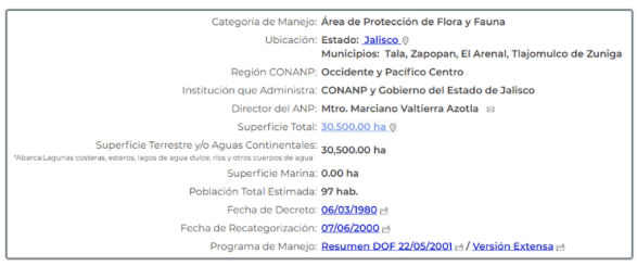 “DECRETO; ARTÍCULO PRIMERO. — Por causa de interés público se establece zona de protección forestal y refugio de la fauna silvestre la región conocida como “La Primavera” que se localiza dentro de una superficie aproximada de 30 mil 500 hectáreas de propiedad particular, en los Municipios de Tala, Zapopan y Tlajomulco, en el Estado de Jalisco”.