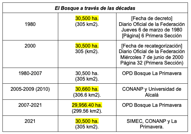 Siguiendo con las contradicciones, una solicitud de transparencia realizada al OPD Bosque La Primavera recupera áreas de 30,500 ha. (1980-2001) y 29,956.40 ha. (2007-2021). Cifras que denotan nuevamente la falta de sincronización institucional para definir cuál ha sido la “verdadera” área del Bosque.