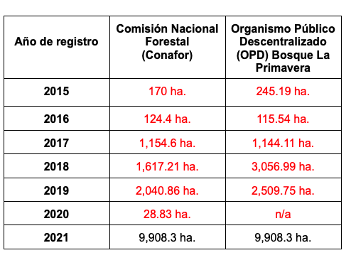 En 2015, por ejemplo, la Conafor registró 170 ha. incendiadas (238 canchas del Estadio Jalisco o 36 Zócalos); sin embargo, la misma institución registró un total de 9,908.3 ha. incendiadas en el año 2021 (13,877 canchas del Estadio Jalisco o 2,117 Zócalos). Cabe mencionar que 2021 fue el único año en que, tanto la Conafor como el OPD Bosque La Primavera, arrojaron exactamente la misma cifra de hectáreas incendiadas.