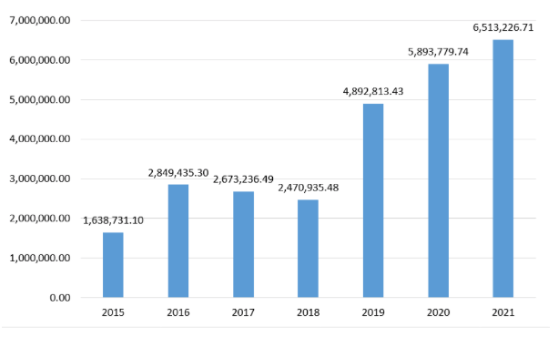 en 2015 se tuvo un total de 245.19 en 2016 115.54, en 2017 1 mil 144.11, en 2018 3 mil 056.99, en 2019 2 mil 509.75 y en 2021 9 mil 908.3.