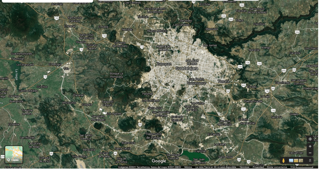La proximidad del Bosque de la Primavera se entiende mejor cuando se ve un mapa satelital. Esto denota un Área Metropolitana “Tapatía” cada vez más expansiva hacia su suroeste, encarando abrasivamente el noreste del Bosque de La Primavera.