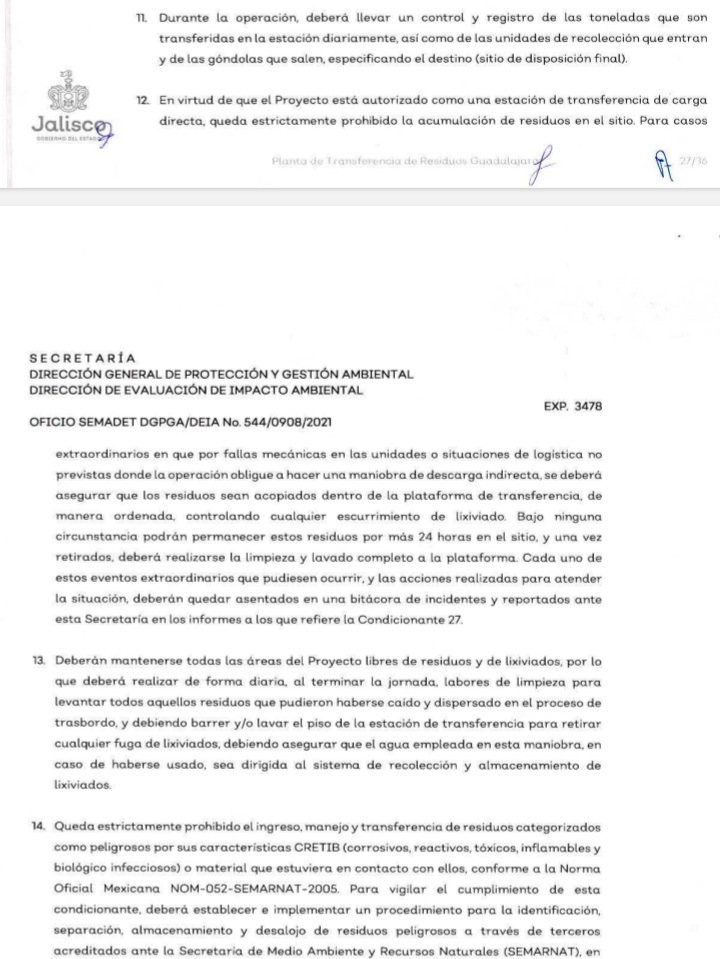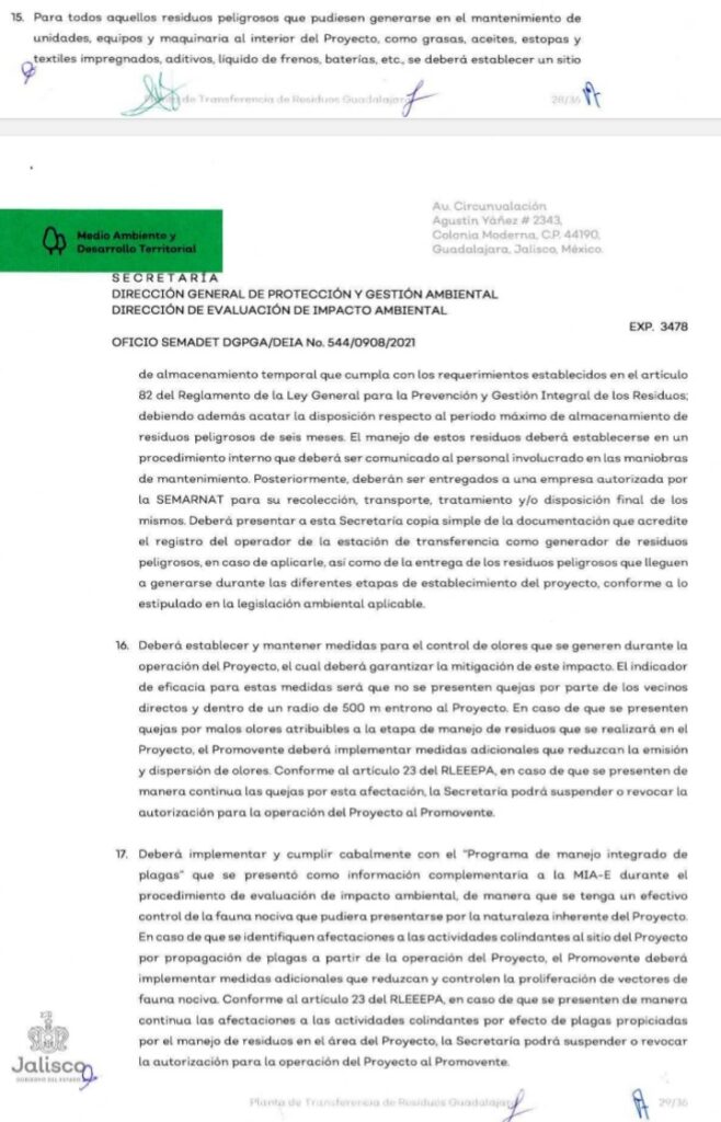 Según la autorización de impacto ambiental emitida el pasado 8 de noviembre, entre las condiciones que debe cumplir el Ayuntamiento de Guadalajara para operar la estación, son medidas para el control de olores, con la finalidad de que no se presenten quejas por parte de vecinos, en un radio de 500 metros a la redonda.