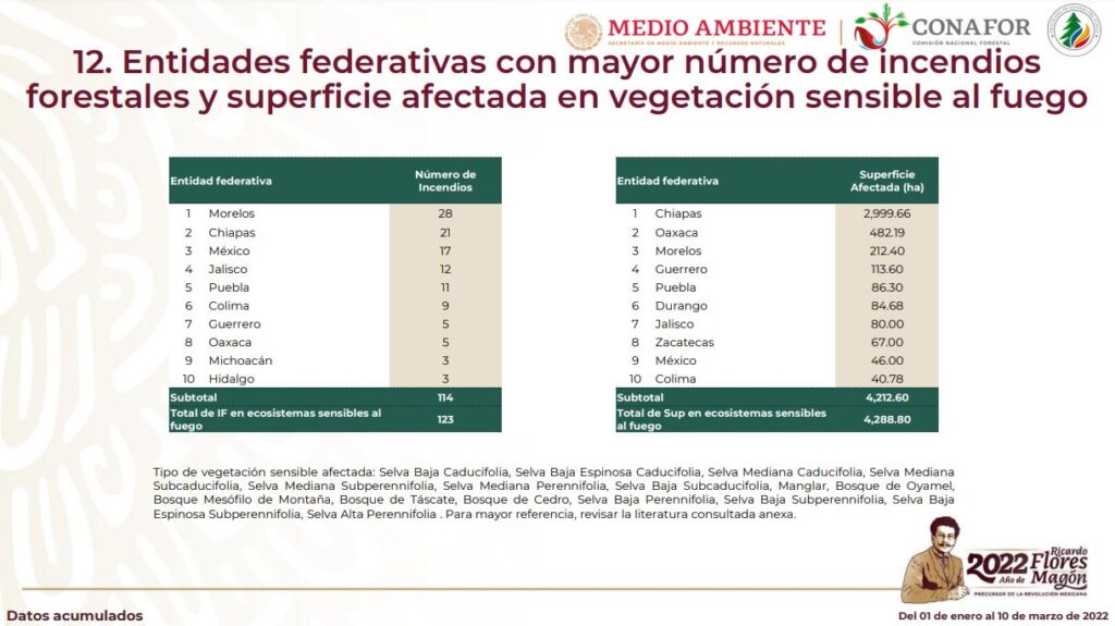 Hasta la semana pasada, Jalisco había registrado 12 incendios que afectaron 80 hectáreas de ecosistemas sensibles al fuego, como selvas o bosques mesófilos de montaña, siendo el cuarto estado del país, sólo debajo de Morelos, Chiapas y el Estado de México.
