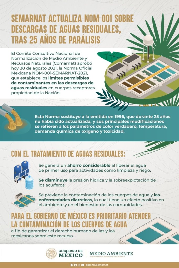 La nueva NOM-001-SEMARNAT-2021 (https://www.dof.gob.mx/nota_detalle.php?codigo=5645374&fecha=11/03/2022/) sustituye a la anterior de 1996 que ya se encontraba obsoleta y las industrias del país tienen cuatro años para modernizar sus plantas de tratamiento de agua para cumplir las nuevas exigencias en remoción de contaminantes antes de arrojar sus desechos a ríos y lagos del país.