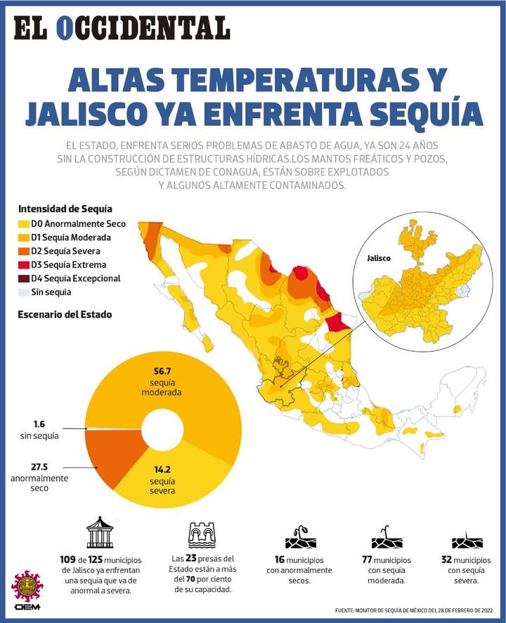 Apenas comienzan las altas temperaturas y 109 de 125 municipios de Jalisco ya enfrentan una sequía que va de anormal a severa. A diferencia del año anterior, en esta ocasión las 23 presas del Estado están a más del 70% de su capacidad, sin embargo la advertencia es que debe de ahorrar en el ritmo del consumo del agua y además que la región de Los Altos será la más castigada.