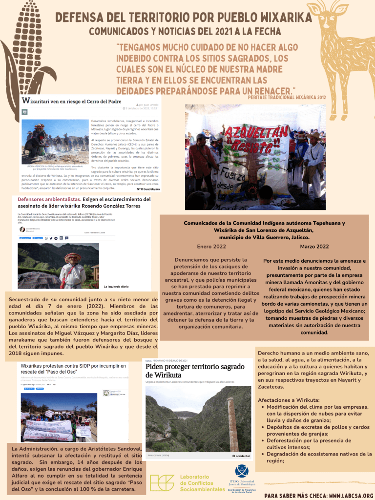 El Consejo Regional Wixárika por la Defensa de los Lugares Sagrados, La Unión Wixárika de Centros Ceremoniales de Nayarit, Jalisco y Durango y el Comité por la Defensa del Agua y Tierra de Catorce convocaron a realizar Altares Espejos el 18 de marzo del 2022, en el Altar realizado en ITESO se hicieron dos carteles para visibilizar las luchas del Pueblo Wixárika en defensa de su territorio y algunas luchas en el Estado de Jalisco de colectivos, comunidades y grupos.